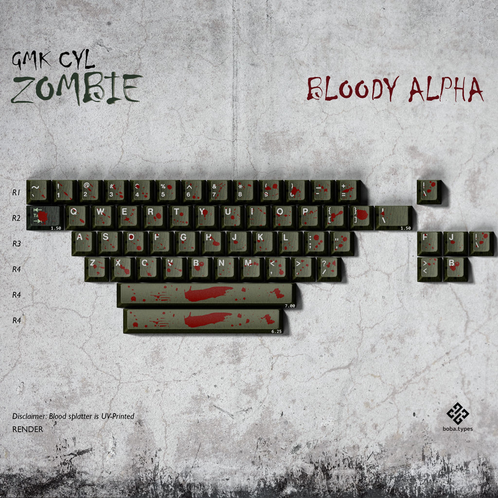 The keycaps here are semi-translucent sickly green, with a sinister-looking inner shell semi-visible through the murky outer layer. The novelties feature various rotting body parts that are double-shot with UV-print elements to add details like blood, eyeball sclera, exposed bone and teeth. Weapons to survive the apocalypse are included too.